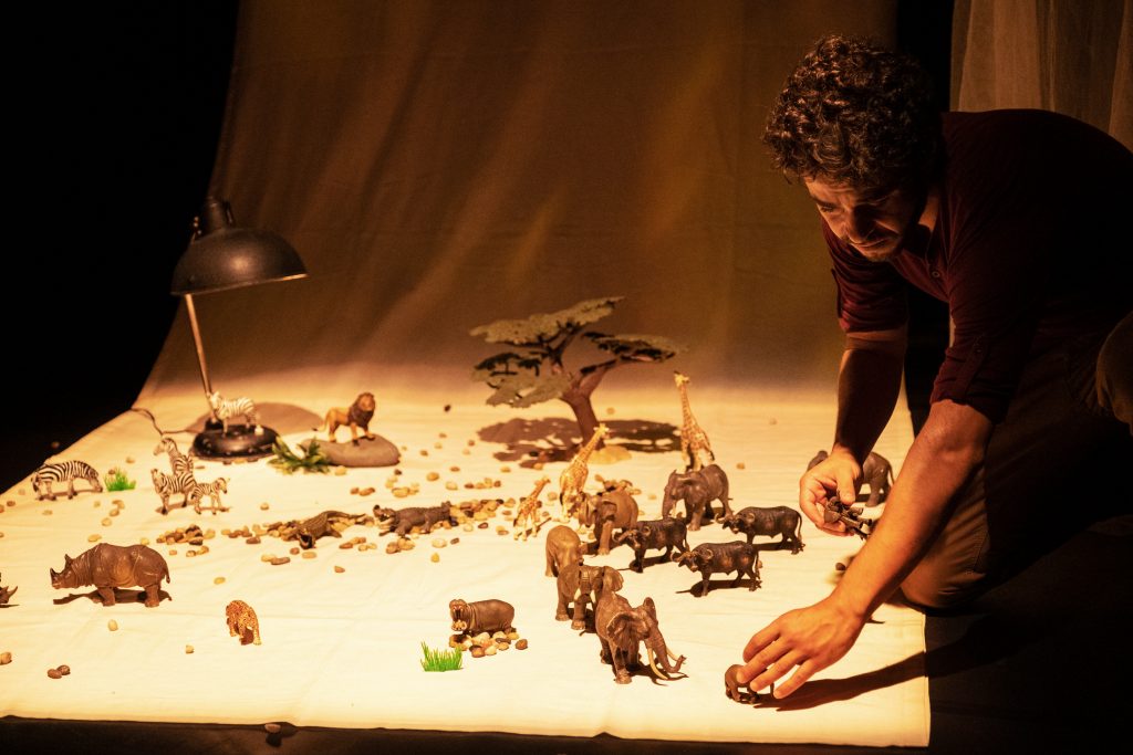 No solo da companhia portuguesa Formiga Atômica, o ator Miguel Fragata apresenta para o público infantil A Caminhada dos Elefantes, que narra uma história sobre a finitude inscrita no livro da vida de cada ser humano.